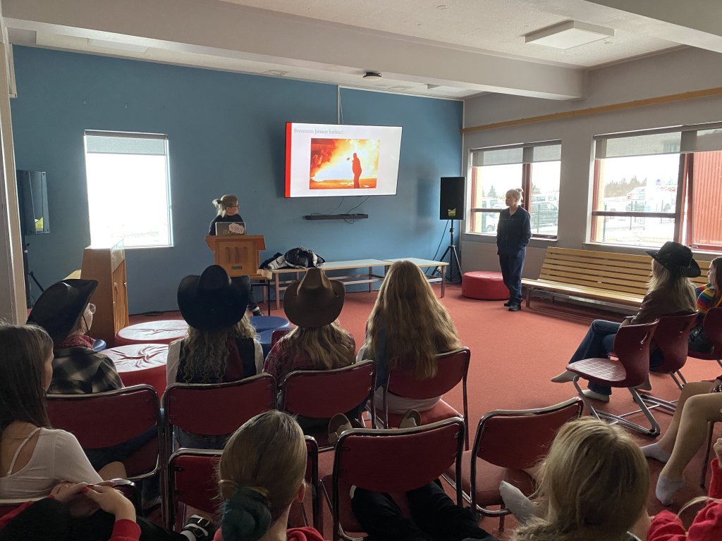 Eftir hádegið fengum við heimsókn frá Skáld í skólum til nemenda á unglingastigi. Rithöfundarnir Bergrún Íris og Elísabet Thoroddsen voru með fyrirlestur um bækur og fóru um víðan völl. Þær sögðu frá mest bönnuðu bókum heims, hvaða bækur hafa verið brenndar á báli, tenging samfélagsmiðla við rithöfunda og bókaútgáfur og hvort gervigreind geti skrifað og teiknað betur en mannfólkið.