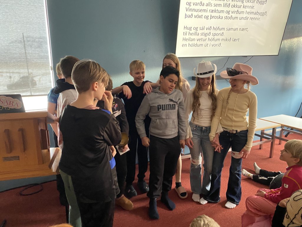 Við enduðum daginn á söngstund þar sem nemendur og starfsfólk tóku vel undir. Einnig voru afhentir farandbikarar til þeirra bekkja sem hlupu lengst að meðaltali í Ólympíuhlaupinu. Alls hlupu nemendur Varmahlíðarskóla 730 kílómetra sem er frábær árangur. Tveir bekkir hlupu flesta kílómetrana; nemendur í 6.bekk hlupu 8.5 kílómetra að meðaltali og nemendur í 8.bekk hlupu 8.6 kílómetra að meðaltali og fengu þessir tveir bekkir farandbikar. Til hamingju!!
